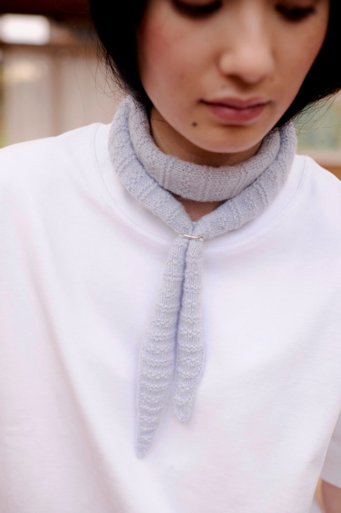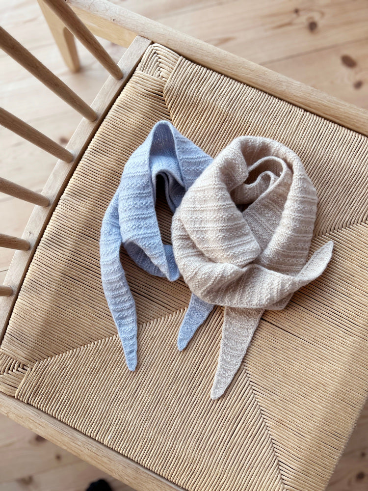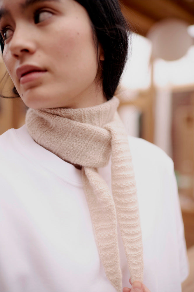 Smalt tørklæde i enkel struktur strik, udelukkende dannet af ret og vrang masker.