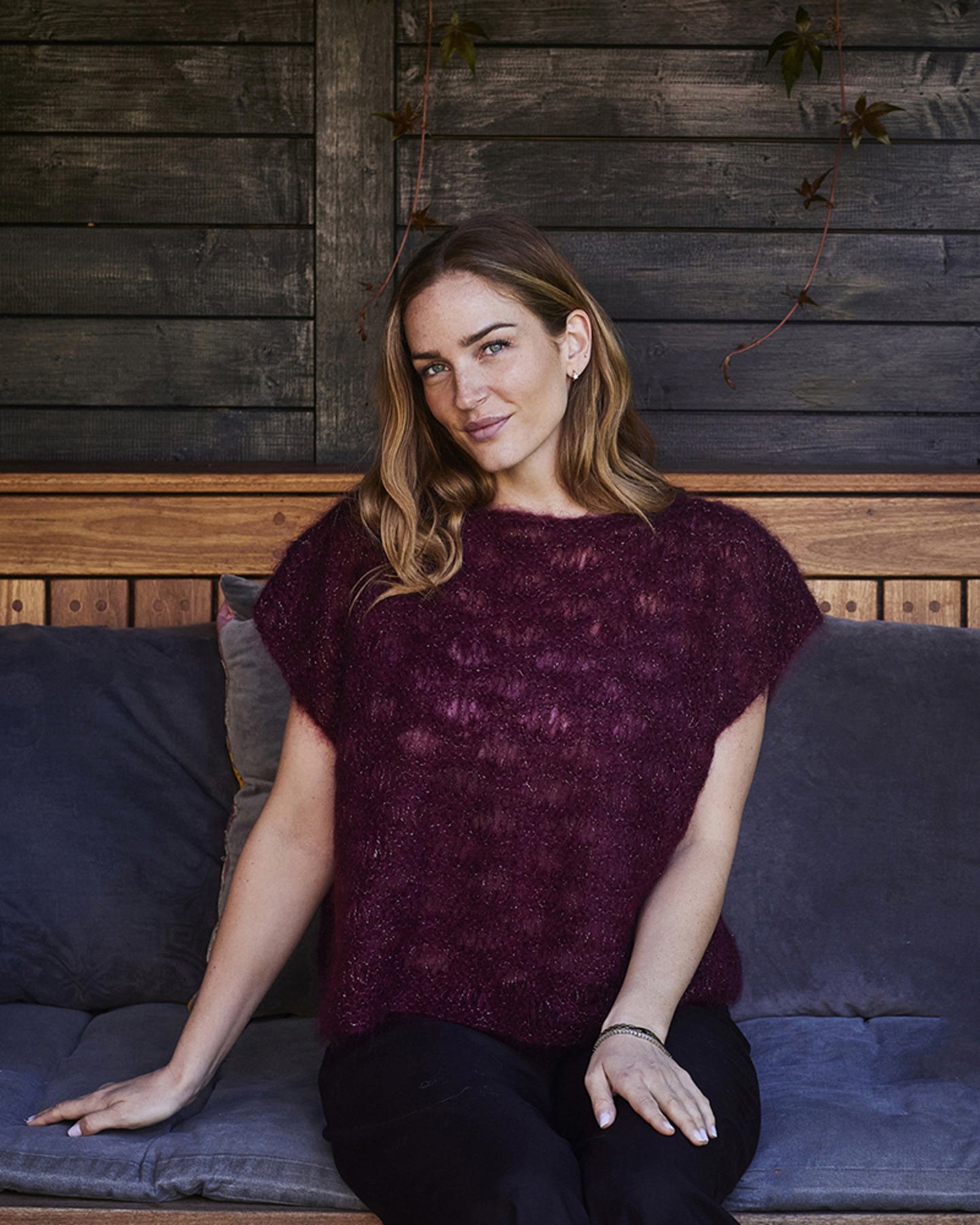 Toppen strikkes nedefra og op i to dele som bagefter sys sammen. Mønsteret dannes ved omslag - såkaldte lange masker.